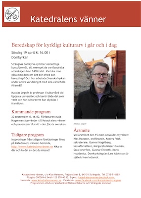 Strängnäs domkyrka rymmer oersättliga konstföremål, till exempel de tre flandriska altarskåpen från 1400-talet. Vad ska man göra med dem om det blir ofred och beredskap? Och hur arbetade Svenska kyrkan under andra världskriget med sina värdefulla föremål? Mattias Legnér är professor i kulturvård vid Uppsala universitet och berör både det som varit och hur kulturarvet kan skyddas i framtiden.